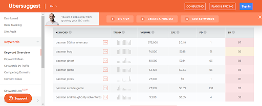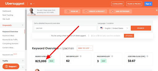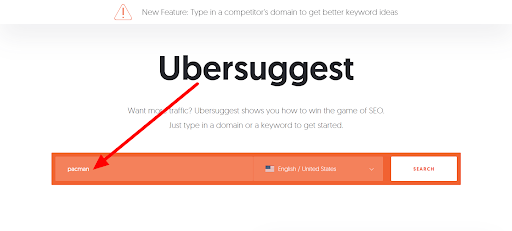 Let’s imagine we want to find some more keywords to use in our Pac-Man review. To get started, we’ll head over to Ubersuggest, which allows us to do keyword research for free. We start by typing our main keyword—pacman—into the search box.